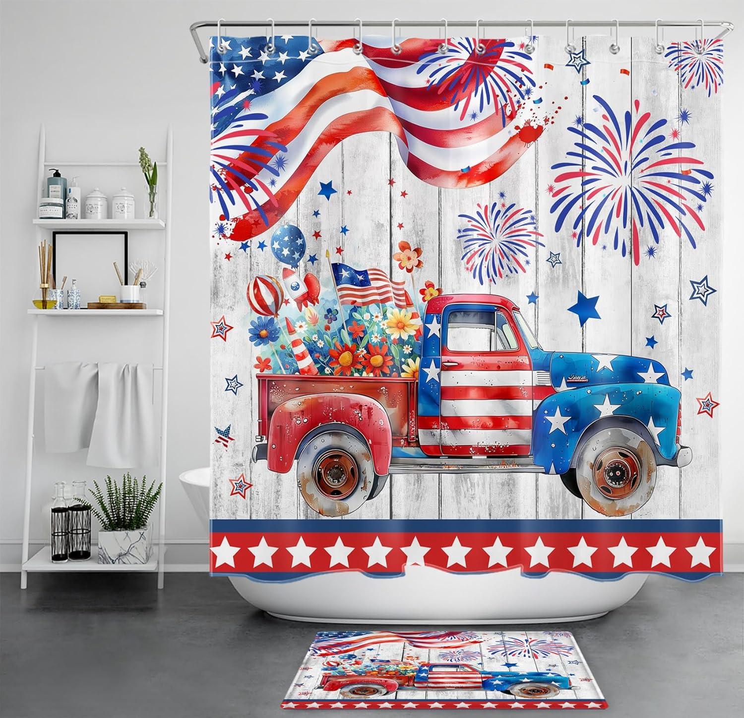 About HVEST : Welcome to HVEST Decoration Art Store, thank you for your support and love, as a fashion-forward home decoration brand, HVEST brings together a variety of shower curtains, size: we have many styles and sizes, you can choose according to your needs, picture: if you have a favorite picture,we can provide customized service. halloween, christmas, valentine's day, st.patrick, easter, spring, summer, fall, winter, independence day, etc.We have a lot of different styles of pictures, you are welcome to choose! HVEST will do our best to create a comfortable home environment for you! About HVEST 4th of July Shower Curtain: The Independence Day shower curtain is made of high-quality polyester material, the fabric is soft, smooth, flowing and comfortable, it is very suitable for bathroom decoration, it not only protects your privacy when you take a shower, but also allows the water to stay in the bathroom. Size: shower curtain size is 70L x 70W inches(180L x 180W cm), bath mat size is 16L x 24W inches(40L x 60W cm). Package Includes: 1x patriotic Bathroom Shower Curtain+12x Plastic Hooks+1x bath mat.CARE INSTRUCTIONS:1. Hand/Machine Washable in cold Water.2. Dry flat or hang to dry in a shaded area, never use a drying machine.